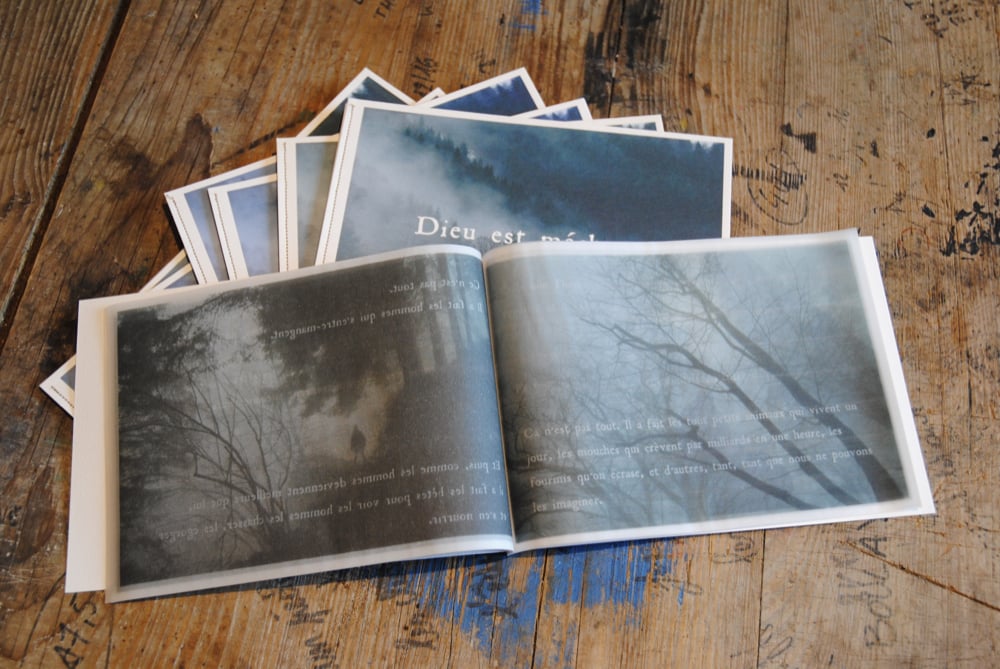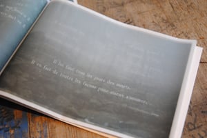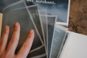 Une tentative de zine imprimé sur papier calque à la maison. L'impression est sortie pas hyper belle, mais l'effet de transparence que je voulais est présent. Ce livre est un mélange entre des photographies prises par moi-même lors d'une randonnée dans le brouillard dans les Alpes italiennes, et un extrait d'une nouvelle de Maupassant particulièrement nihiliste et black metal.